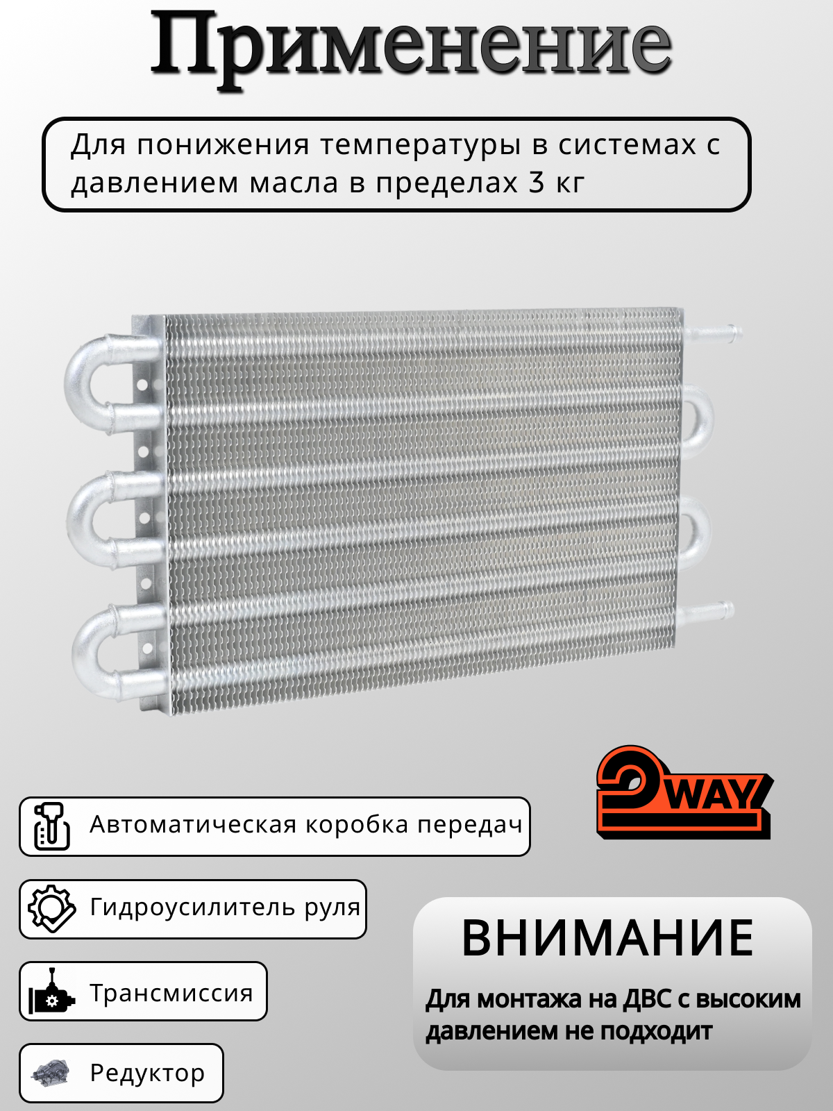Используется для понижения температуры в системах с давлением масла в пределах 3 кг. — автоматическая коробка передач, гидроусилитель руля, трансмиссия, редуктор и др. Для монтажа на ДВС с высоким давлением не подходит.