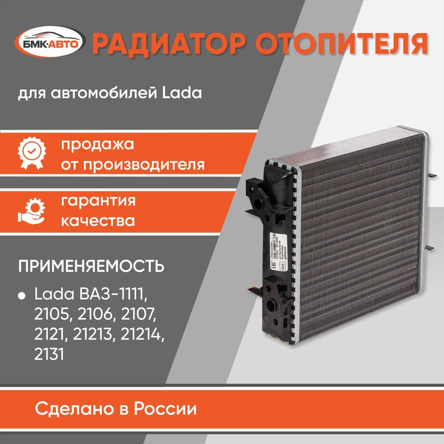 Радиатор отопителя (печки) ВАЗ 2101-07, 2121 н/о (широкий) Радиатор отопителя ВАЗ 2101 можно купить со склада в Тольятти у производителя автозапчастей бмк-авто. Представленная продукция производится по заказу бмк-авто, проходит обязательный контроль качества и только после этого упаковывается в тару с логотипом компании.