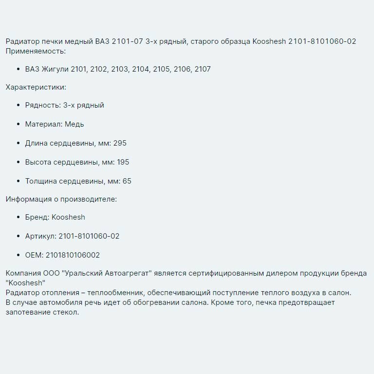 Радиатор печки медный ВАЗ 2101-07 3-х рядный, старого образца Kooshesh 2101-8101060-02
