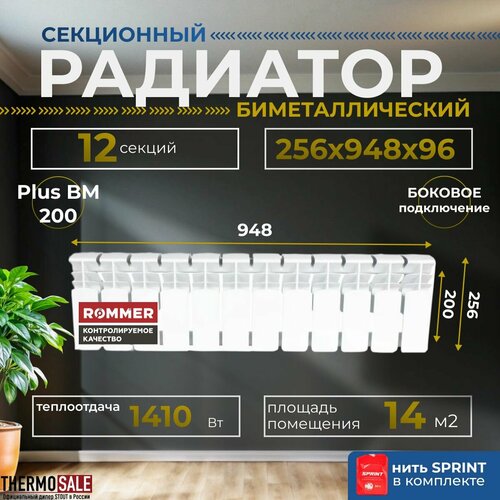 Купить Радиатор секционный биметаллический Plus BM 200 12 секций параметры 256х948х96 боковое подключение Сантехническая нить 20 м с доставкой по всей России.