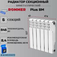 Купить Радиатор секционный биметаллический Plus BM 500 6 секций параметры 557х474х95 боковое подключение Сантехническая нить 20 м с доставкой по всей России.