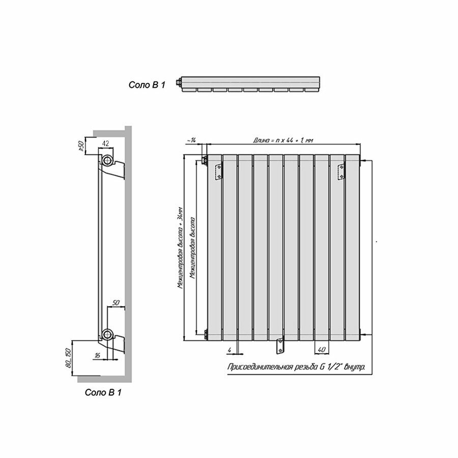| Подробная комплектация | радиатор «Соло В» 1 шт.; паспорт 1 шт.; дизайн–комплект 1/2" (пробка, кран Маевского) 1 компл.; упаковка. |