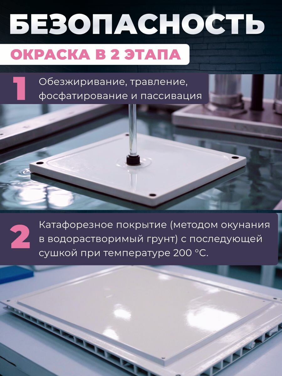 Затем наносится слой порошковой белой эмали с последующей термообработкой, что обеспечивает высокую степень защиты от коррозии и обеспечивает экологическую безопасность продукта.