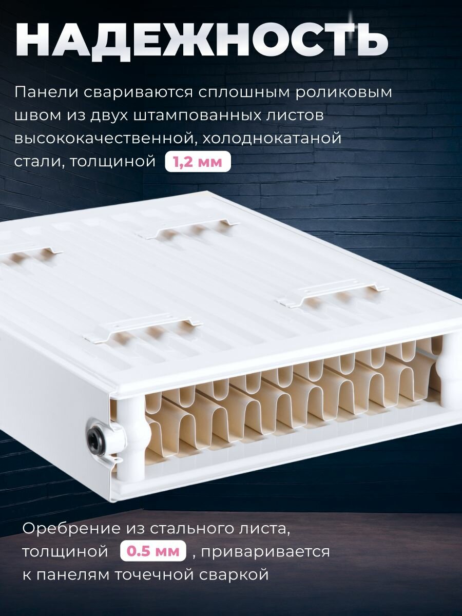 Панели радиатора свариваются сплошным роликовым швом из двух штампованных листов высококачественной, холоднокатаной стали толщиной 1,2 мм.