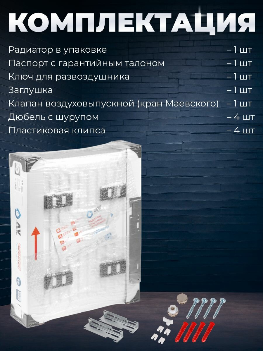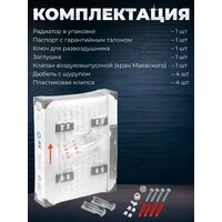 | Подробная комплектация | радиатор 1 шт, паспорт с гарантийным талоном 1 шт, ключ для развоздушника 1 шт, заглушка 1 шт, клапан воздуховыпускной (кран Маевского) 1 шт, дюбель с шурупом - комплект, пластиковая клипса - комплект, упаковка |