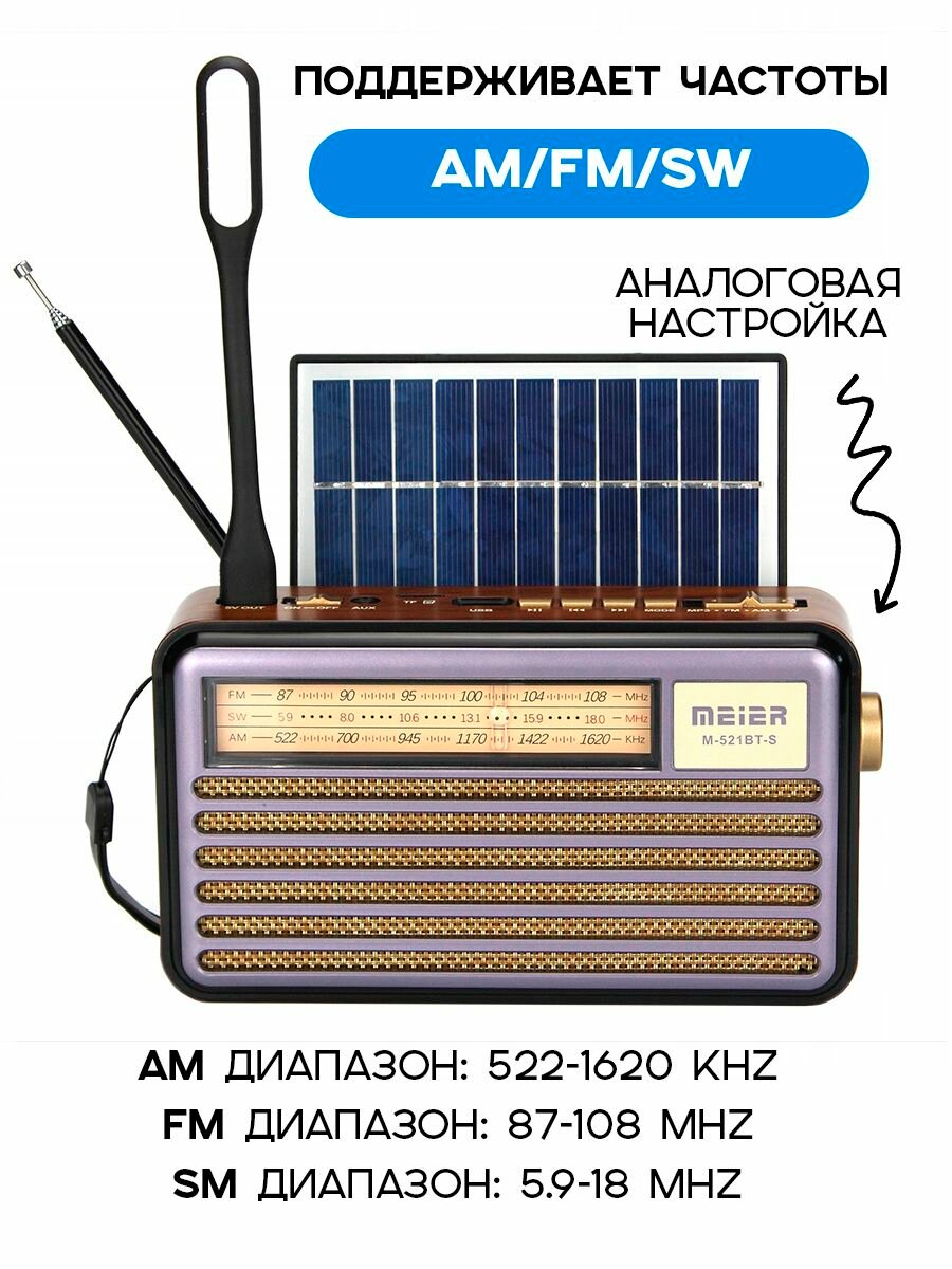 Радиоприемник Meier M-521BT-S с солнечной панелью / радио с Bluetooth, microSD, USB для флешки, цвет — сиреневый: сравнение цен, характеристики, фото, актуальное наличие и цены.