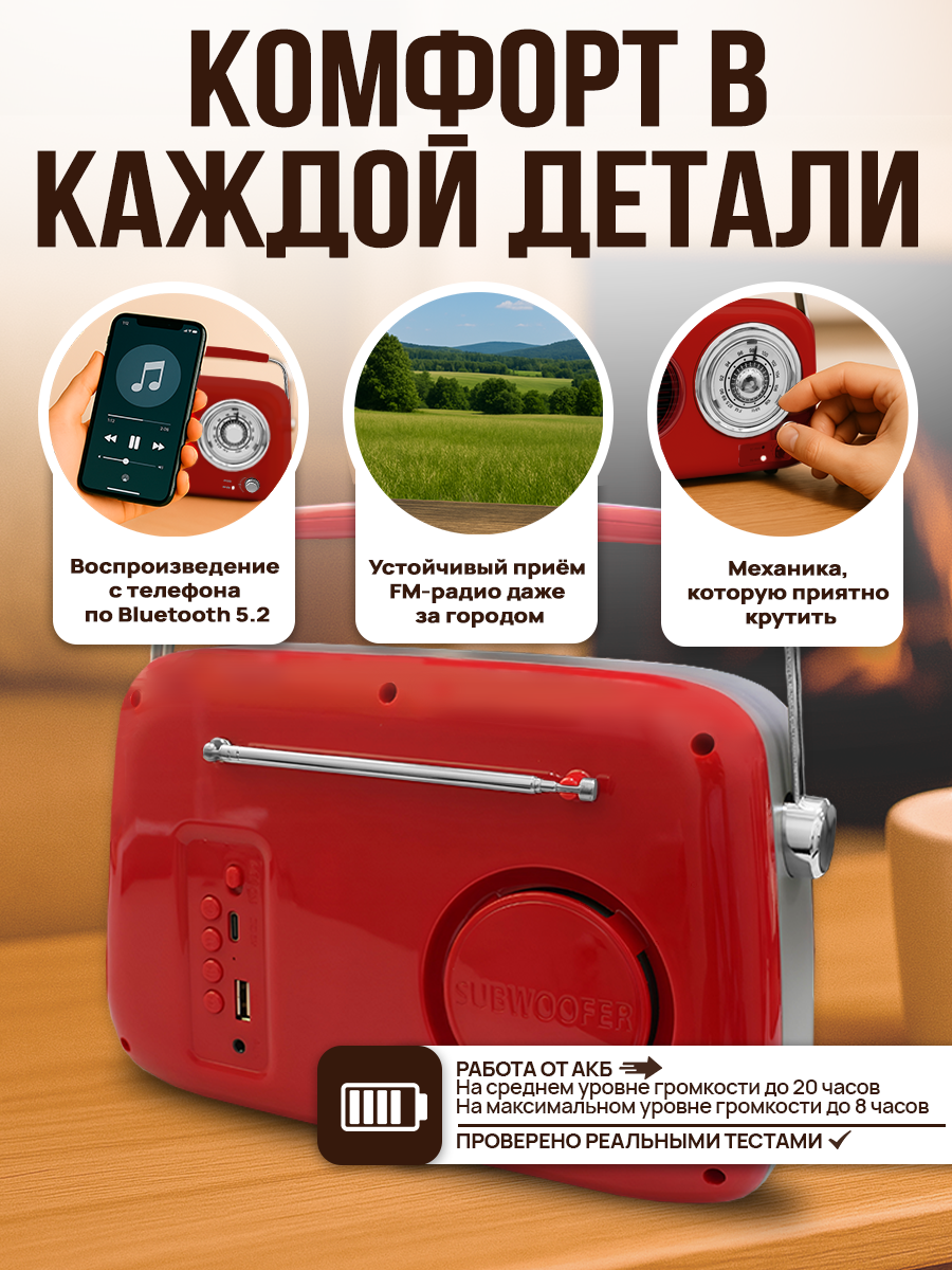 Этот аккумуляторный радиоприёмник не только функционален, но и эстетически привлекателен. Его ретро-дизайн станет стильным акцентом в любом интерьере, а портативность позволит брать его с собой в путешествия или на пикники. Независимо от того, где вы находитесь, вы всегда будете на связи с миром благодаря этому уникальному радио.