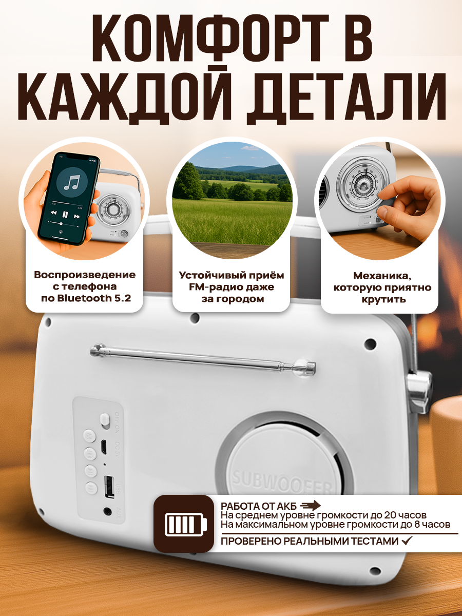 Аккумуляторный радиоприемник — это не только стильный аксессуар, но и надежный источник информации и развлечений. Он станет отличным дополнением к вашему интерьеру, добавив нотку ретро-стиля. Радио с возможностью подключения к сети через USB и AUX обеспечивает универсальность и удобство использования, делая его незаменимым в повседневной жизни.
