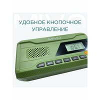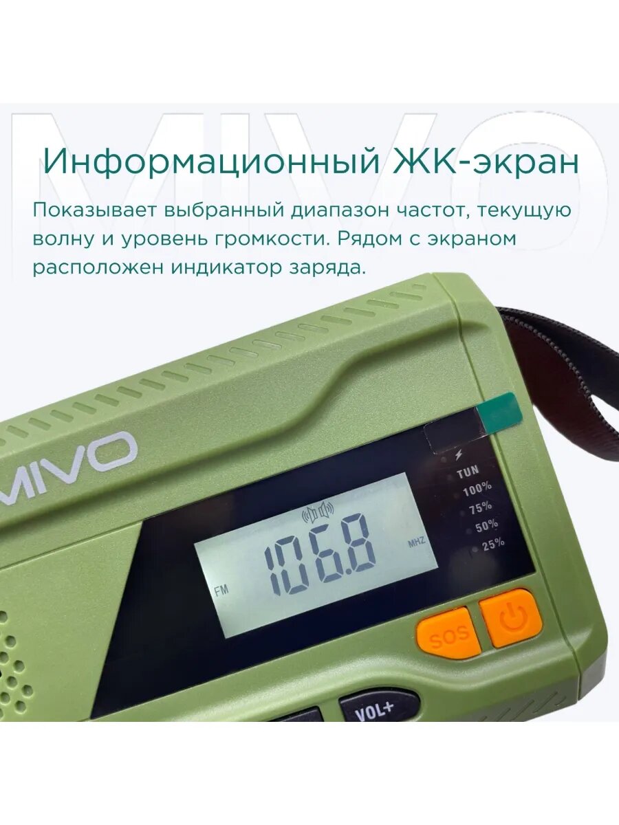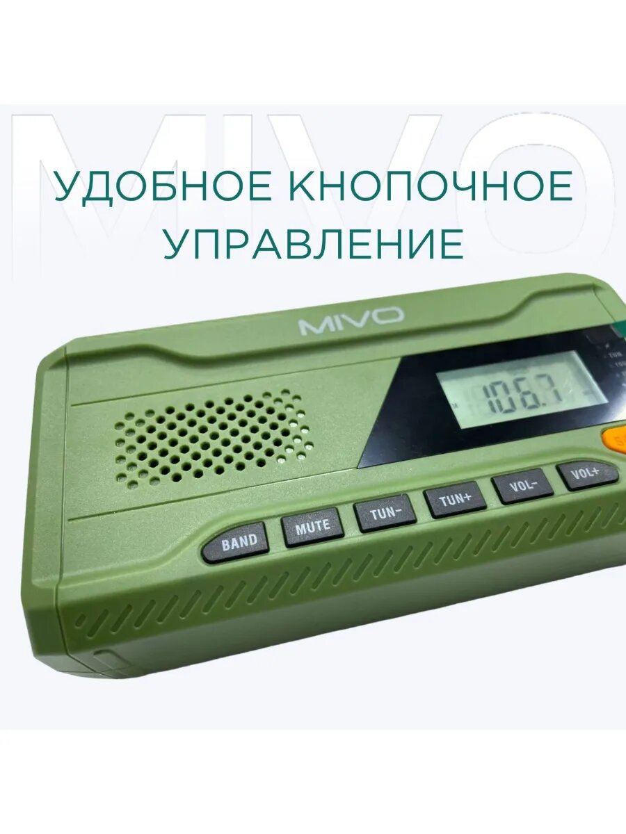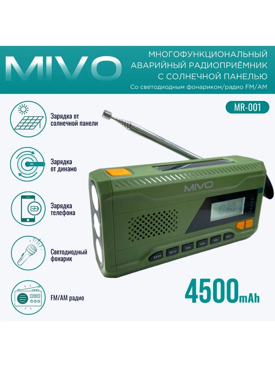 Многофункциональный походный FM радиоприемник MIVO MR-001. Сделан очень качественно. Настоящий походный приёмник с нужными фишками. Солнечная батарея для подзарядки аккумулятора. Динамо-машинка (генератора постоянного тока) для ручной подзарядки аккумуляторов. Приемник имеет встроенный повер банк 4500 мАч и разъем USB, через который, всегда можно подзарядить, свой севший смартфон. В приемник MIVO MR-001 встроен светодиодный фонарь. И конечно же отличный радиоприемник FM и AM диапазонов с ЖК дисплеем. Автопоиск каналов. Характеристики: FM диапазон: 76-108 МГц АМ диапазон: 520-1710 кГц (10К) / 522-1629 кГц (9К) Светодиодный фонарь: 1 Вт*3 дальний свет/ближний свет/ для чтения Перезаряжаемый: Power Bank АКБ 4500 мАч Зарядка солнечными панелями: 80 мА/5 В Динамик: 40х40 мм, 3 Вт Мигающие индикаторы (показывают % заряда батарей). Звуковые эффекты SOS ( мигает фонарь и работает сирена). ЖК-дисплей USB выход 5В-2А Антенна: телескопическая Выход для наушников: 3.5 мм Питание: Type-C мощность 5В-2А (адаптер не входит) Ремешок: есть Класс водонепроницаемости: IPX4 Размер:150х75х40 мм Вес: 300 г