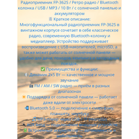 Радиоприемник FP-362S / Ретро радио / Bluetooth колонка / USB / MP3 / 10 Вт / с солнечной панелью и аккумулятором