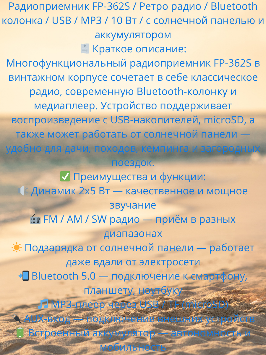 Многофункциональный радиоприемник FP-362S в винтажном корпусе сочетает в себе классическое радио, современную Bluetooth-колонку и медиаплеер. Устройство поддерживает воспроизведение с USB-накопителей, microSD, а также может работать от солнечной панели — удобно для дачи, походов, кемпинга и загородных поездок.