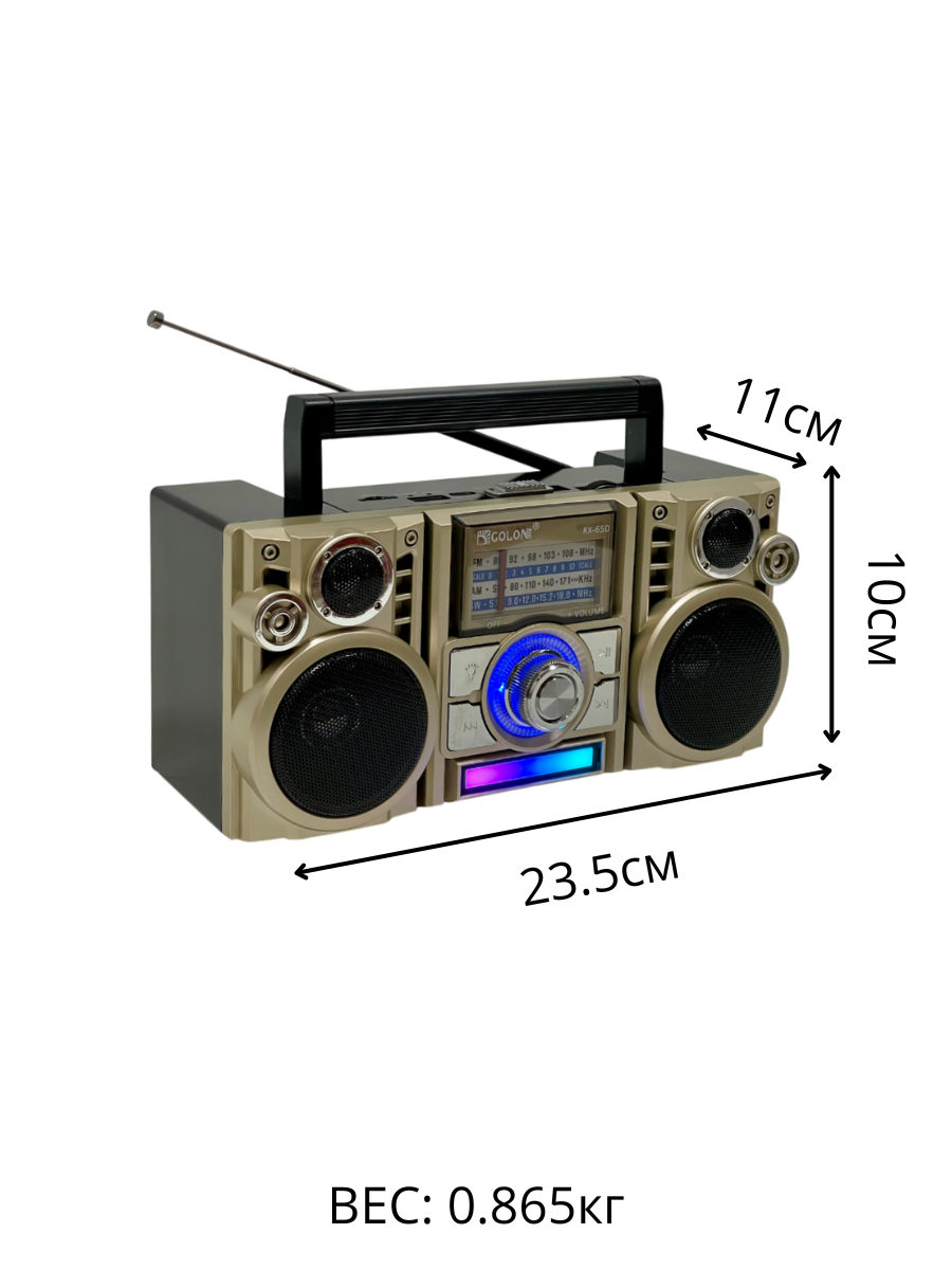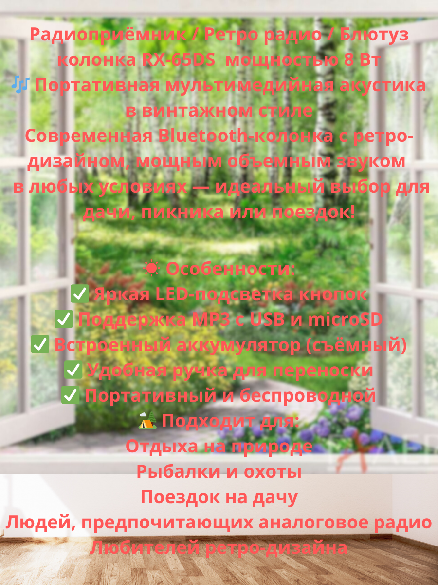 Радиоприёмник / Ретро радио / Блютуз колонка RX-65DS с солнечной панелью и мощностью 8 Вт Портативная мультимедийная акустика в винтажном стиле Современная Bluetooth-колонка с ретро-дизайном, мощным объемным звуком и встроенной складной солнечной панелью для подзарядки в любых условиях — идеальный выбор для дачи, пикника или поездок! ________________________________________Характеристики: • Мощность: 8 Вт (объемный звук) • Питание: o Аккумулятор 18650 (в комплекте) o Зарядка от USB Type-C (5V) o Зарядка от солнечной панели • Радио: o FM: 64/88 – 108 MHz o AM: 530 – 1710 KHz o SW: 5.9 – 18.0 MHz • Интерфейсы и поддержка: o Bluetooth 5.0 o USB (флешки) o TF / microSD • Управление: o Механическая настройка частот (аналоговый тюнер) o Переключение режимов MUSIC / FM / AM / SW o Регулятор громкости с LED-подсветкой ________________________________________ Особенности: • Солнечная панель для подзарядки без розетки • Яркая LED-подсветка кнопок • Поддержка MP3 с USB и microSD • Встроенный аккумулятор (съёмный) • Удобная ручка для переноски • Портативный и беспроводной ________________________________________ Подходит для: • Отдыха на природе • Рыбалки и охоты • Поездок на дачу • Людей, предпочитающих аналоговое радио • Любителей ретро-дизайна ________________________________________ Идеально для: • Дачи, рыбалки, кемпинга • Пожилых людей, любящих радио • Подарка в ретро-стиле • Прослушивания музыки без интернета ________________________________________ Радиоприемник, радиоприемник с солнечной батареей, ретро радио с Bluetooth, блютуз колонка с радио, портативная колонка на аккумуляторе, радио с USB и microSD, RX-65DS радио, RX-65D радио, ретро магнитола, радиоприемник с аккумулятором, радиоприемник для дачи, bluetooth колонка с радио, колонка с AM/FM/SW, музыкальный центр ретро, колонка на солнечной батарее, автономное радио с батареей