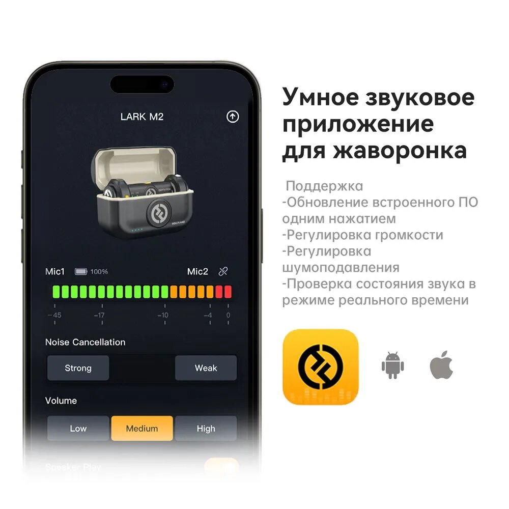 LARK M2 поддерживает удобное приложение LarkSound, которое позволяет через смартфон обновлять прошивку, регулировать громкость и шумоподавление, а также проверять состояние звука в режиме реального времени.