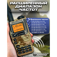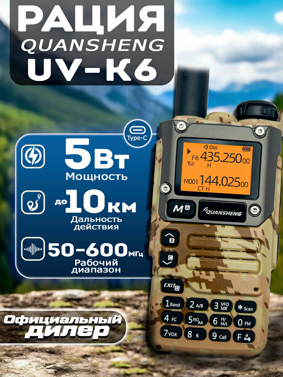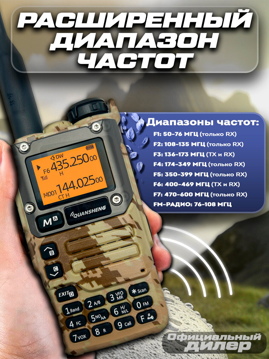 Quansheng UV-K6 радиостанция имеет два основных рабочих диапазона: от 136 до 174 МГц и от 400 до 470 МГц. Однако, ее уникальность заключается в том, что она способна принимать сигналы в расширенном диапазоне от 50 МГц до 600 МГц (с некоторыми пропусками) включая авиационные и речные частоты. Кроме того, радиостанция предоставляет возможность настроить ее на прием 15-го канала гражданского диапазона (CB), который работает на частоте 27.135 МГц. Для этого потребуются дополнительные аксессуары: переходник SU-322 и специальная антенна для приема CB частот.