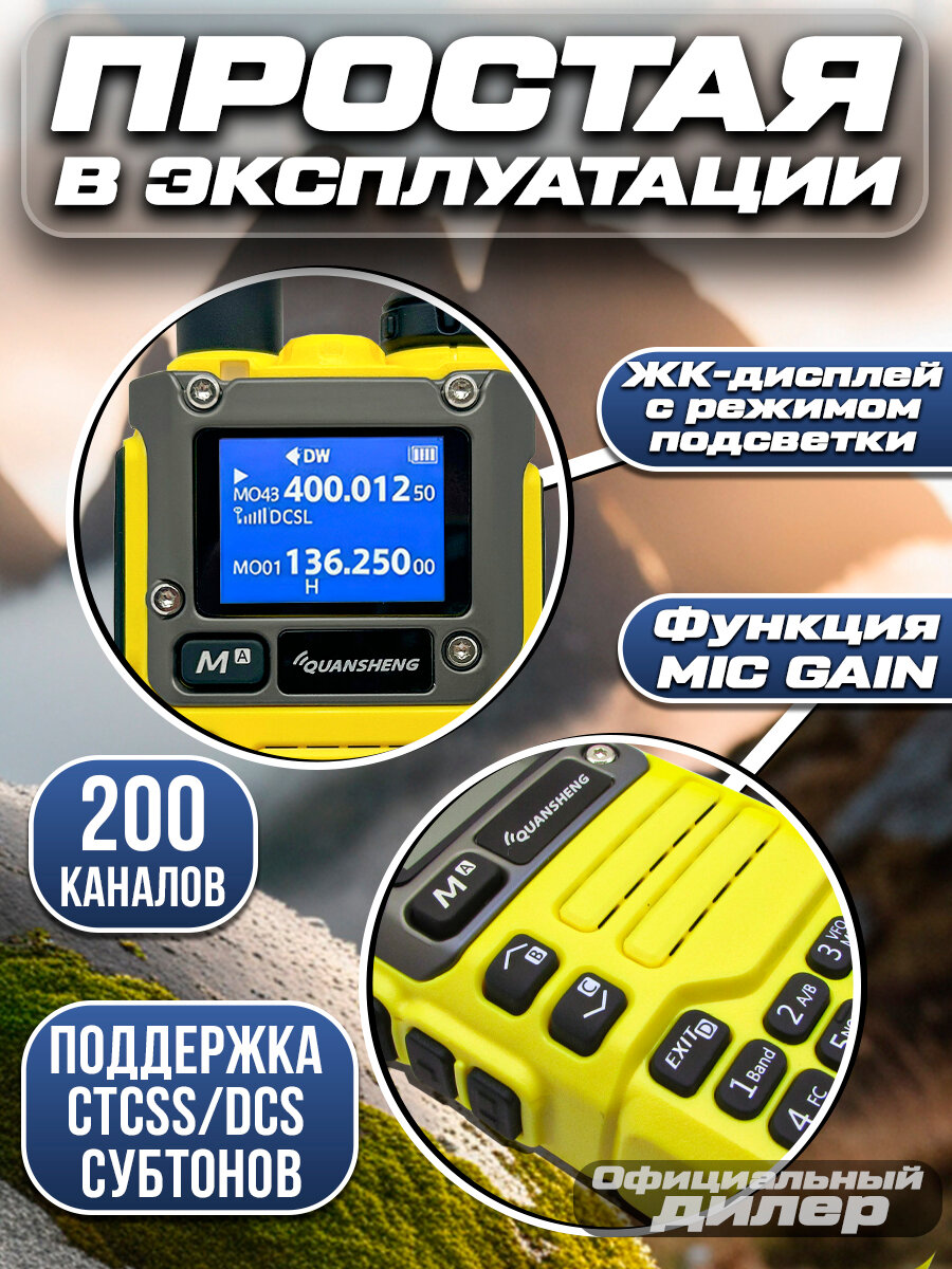 Рация Quansheng UV-K6 представляет собой обновленную модель радиостанции с улучшенным стильным дизайном и предлагает выбор из семи цветов: чёрный, оранжевый, зелёный, жёлтый, прозрачный, зелёный камуфляж и песочный камуфляж.