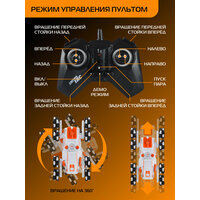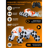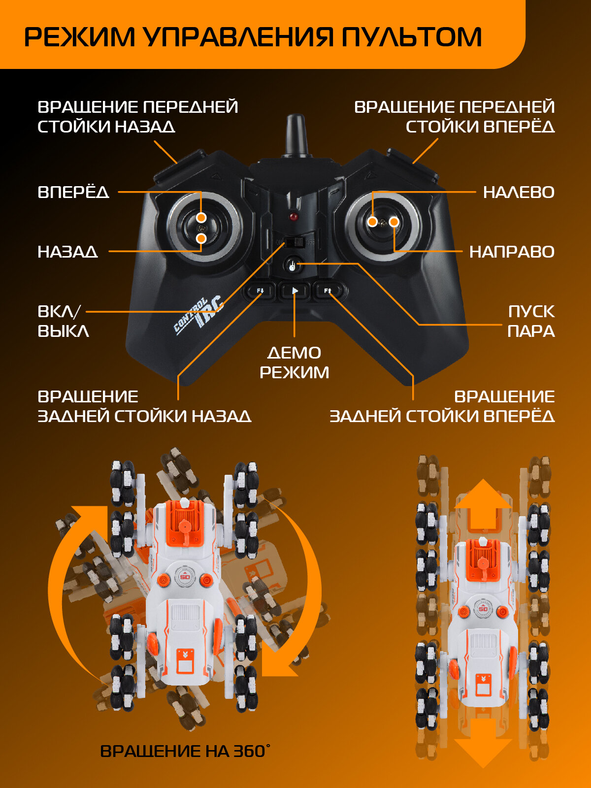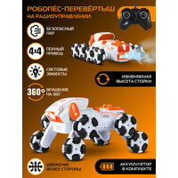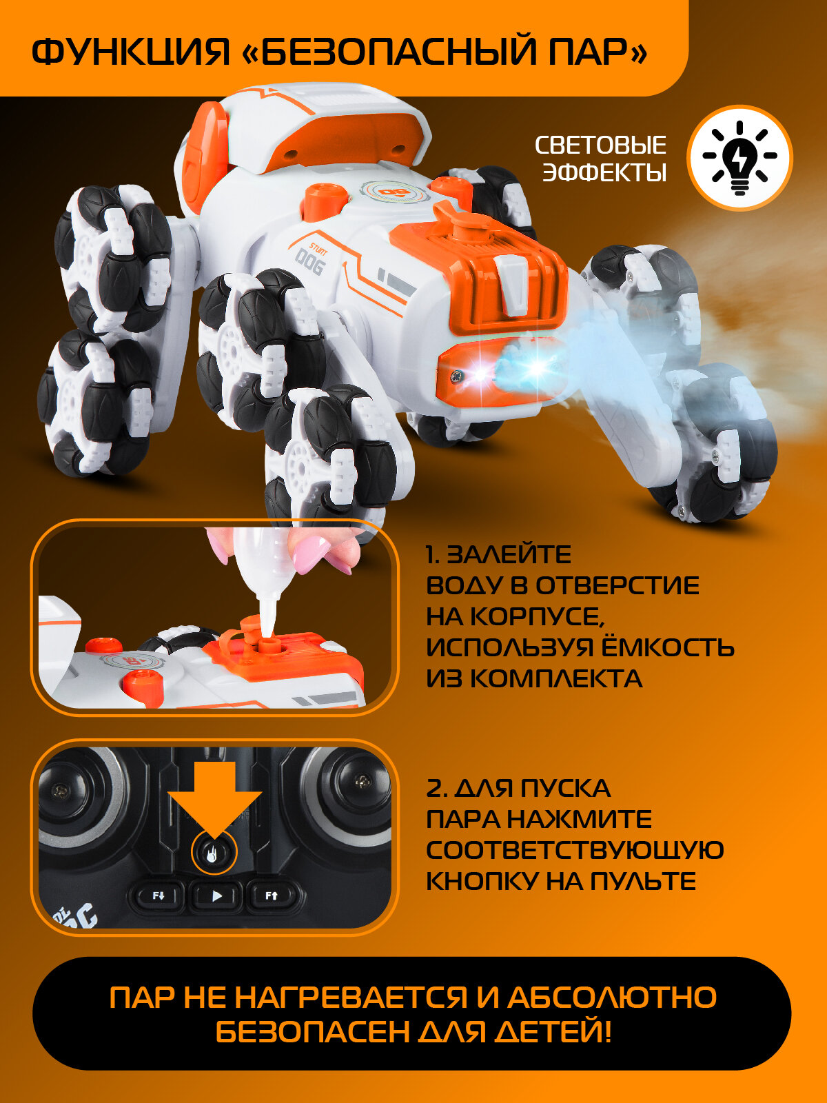 Робот-перевёртыш в виде собаки оснащён инновационными колёсами, в протекторы которых встроены ролики, позволяющие игрушке двигаться в любых направлениях, в том числе разворачиваться на 360 градусов и вращаться на месте. Колесные пары игрушки предполагают возможность вращения по оси, таким образом вы можете регулировать высоту стойки робопса. Ещё одной удивительной особенностью игрушки является функция пара, для активации которой нужно снять заглушку отверстия на верхней части корпуса и залить туда воду с помощью специальной ёмкости из комплекта. Пуск пара активируется нажатием соответствующей кнопки на пульте управления, пар не нагревается и абсолютно безопасен для детей.