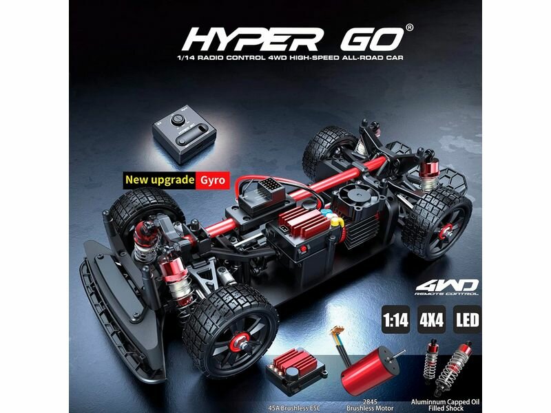 Полный привод повышает проходимость и управляемость модели. На Hyper Go установлен бесколлекторный двигатель 2845 4200KV, влагозащищенный приемник и регулятор ESC 45А. Мощный аккумулятор Li-Ion 7.4V 2000 mAh, идущий в комплекте, придает модели большую мощность! Пульт управления на частоте 2.4Ghz позволит управлять моделью на расстоянии до 60 метров. LED подсветка фар и кузова сделает игру в темное время суток незабываемой.