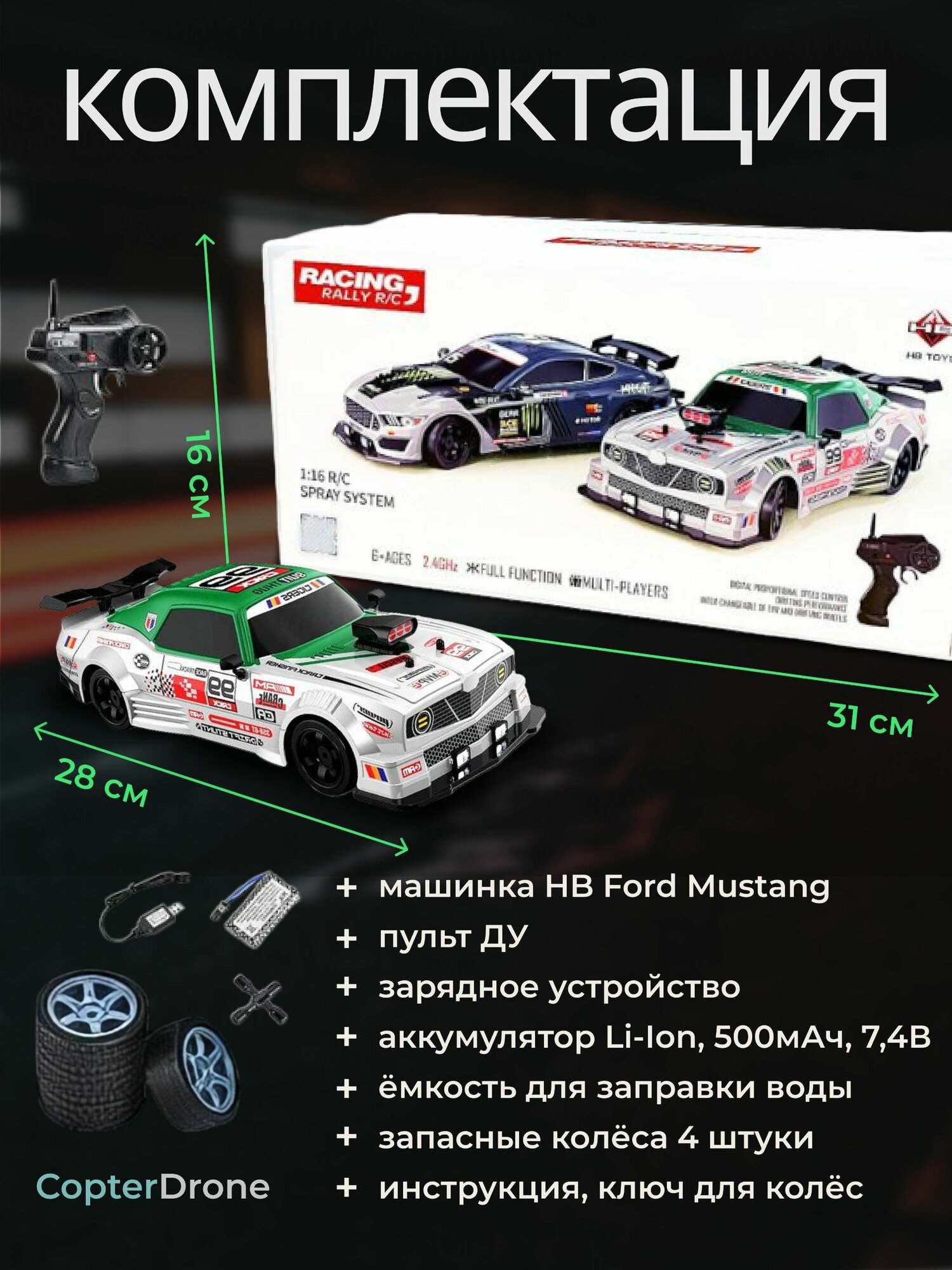 Радиоуправляемая машина для дрифта HB Ford Mustang (4WD, свет, пар, акб, 1:16) - SC16A08-1 - это машина, которая предназначена для дрифта. Она имеет полный привод и выполненная в масштабе 1:16. Машинка управляется при помощи пульта ДУ, работающего на частоте 2,4 ГГц. В наборе также поставляются комплект запасных колес, ключ для смены колес, зарядное устройство и аккумулятор. Во время движения у машинки светятся фары и можно активировать спрей-пар из выхлопной трубы.