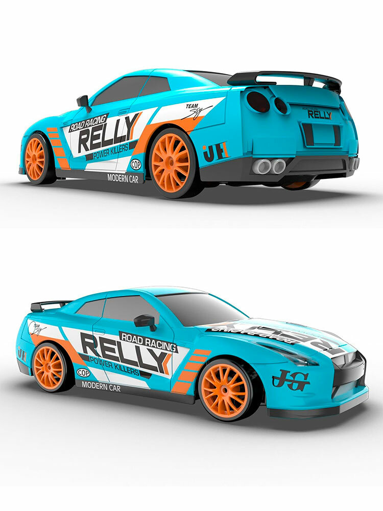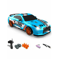 Радиоуправляемая машина для дрифта Nissan GT-R (19 см, 15 км/ч, сменные колеса, фишки) - SC24A08 - это машина, которая предназначена для дрифта. Она имеет полный привод и выполненная в масштабе 1:24. Машинка управляется при помощи пульта ДУ, работающего на частоте 2,4 ГГц. В наборе также поставляются комплект запасных колес, дорожные конусы, зарядное устройство и аккумулятор. Во время движения у машинки светятся фары.