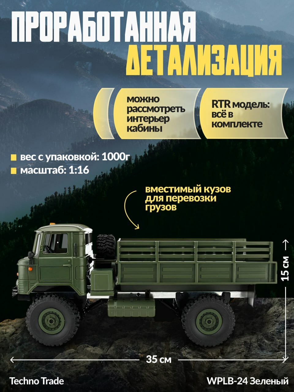 Полностью готовая модель военного грузовика масштаба 1:16 с постоянным полным приводом, коллекторным электромотором, пультом управления 2.4GHz, Li-Po аккумулятором и USB зарядным устройством. Мощная полноприводная система и усиленное пластиковое шасси позволяют подниматься по крутым склонам с груженным кузовом и легко ездить по неровным дорогам. В ночное время включите свет и продолжайте управлять грузовиком.