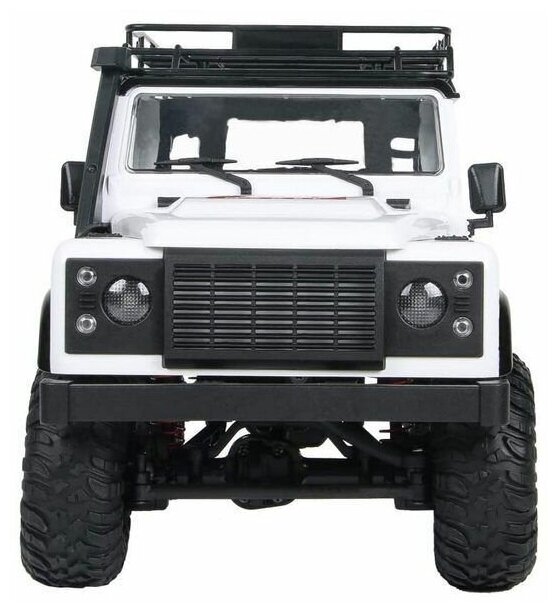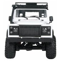 Кузов модели в точности повторяет оригинальный внедорожник Defender D90 для заездов по суровому бездорожью - радиаторная решетка и колесные раки, воздухозаборник и накрышный багажник, а также фары. Цвет кузова - фирменный белый, для трофи заездов по полному бездорожью. Фары светятся, поэтому можно кататься в ночное время. В кабине с высокой детализацией также выполнен салон с сиденьями и приборной панелью. Модель построена на популярном шасси, на котором выпускаются хорошо знакомые грузовики Урал и Газ 66. Это стальное рамное шасси. Подвеска имеет передний и задний мост в которых расположены редукторы, на каждое колесо идет пружинный амортизатор. Полный привод осуществляется за счет карданной системы. Увеличенный клиренс поможет преодолеть большие валуны, бревна или грязевой затор. Машинку можно использовать как дома, так и на улице в сухую погоду. Модель полностью ремонтопригодна, можно легко заменить любую деталь подвески, а также сервопривод или мотор.