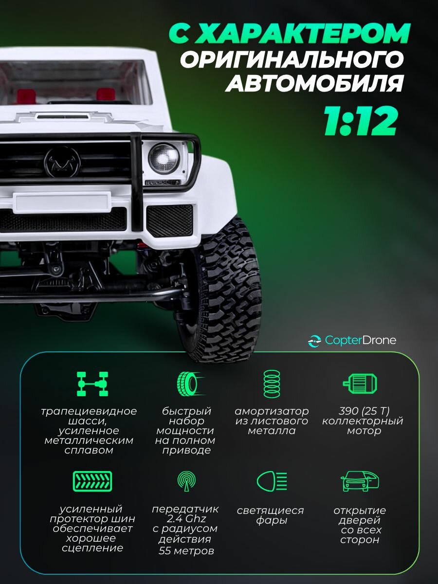 Радиоуправляемый внедорожник Гелик G500 4WD 1:12 - MN-86-WHITE - это прототип Daben G-Class - один из самых мощных внедорожников в мире. Простые и четкие линии обозначают жесткие линии внедорожных транспортных средств и обладают уникальной роскошью и классическим характером оригинального автомобиля.