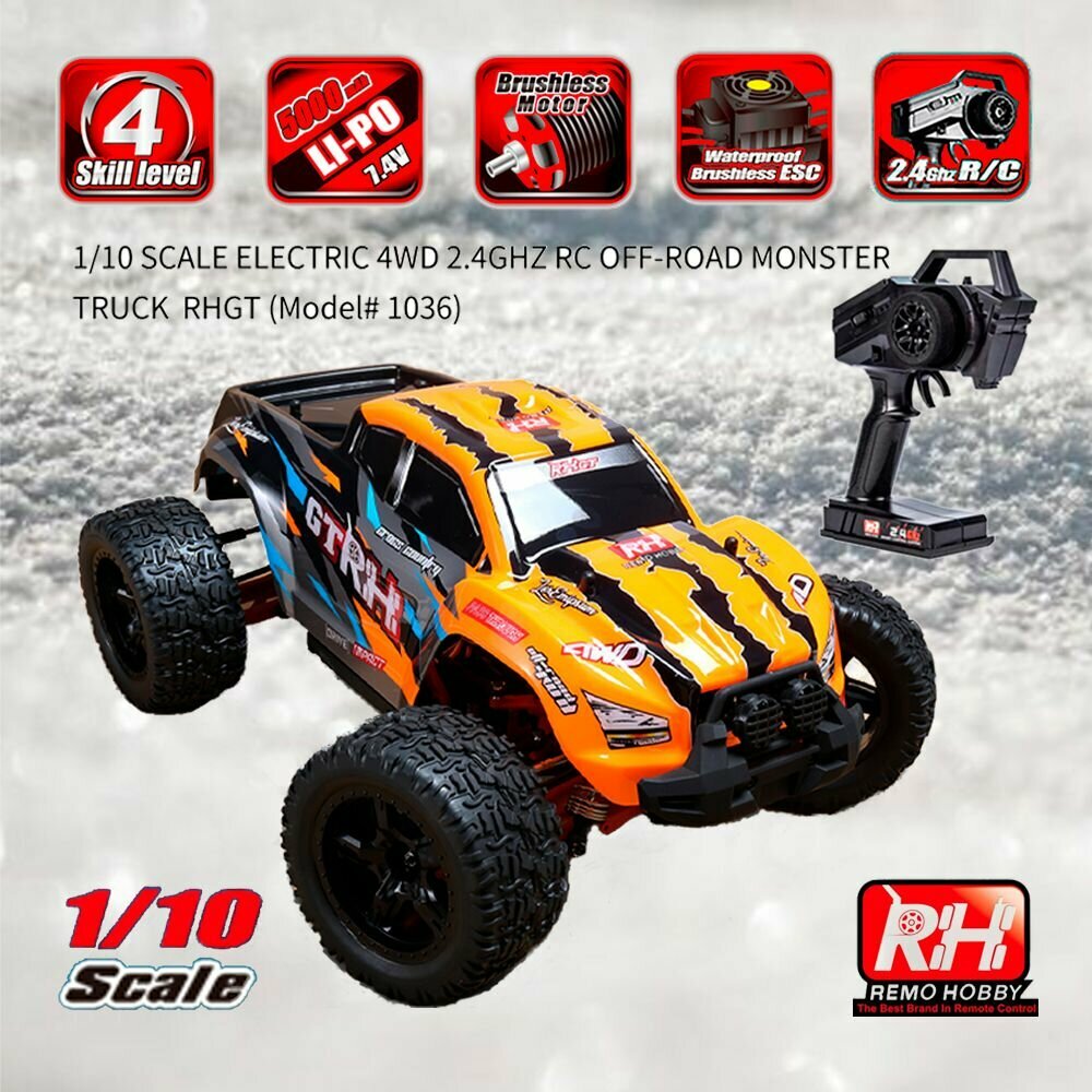 Радиоуправляемая машина Monster-Truck от Remo Hobby модель RH1036 GT в масштабе 1:10, с бесколлекторным электродвигателем, полном приводом 4WD и высокой проходимостью. Влагозащита электроники, аккумулятор Li-Po 5000 mah 7.4 V, полное пропорциональное управление.