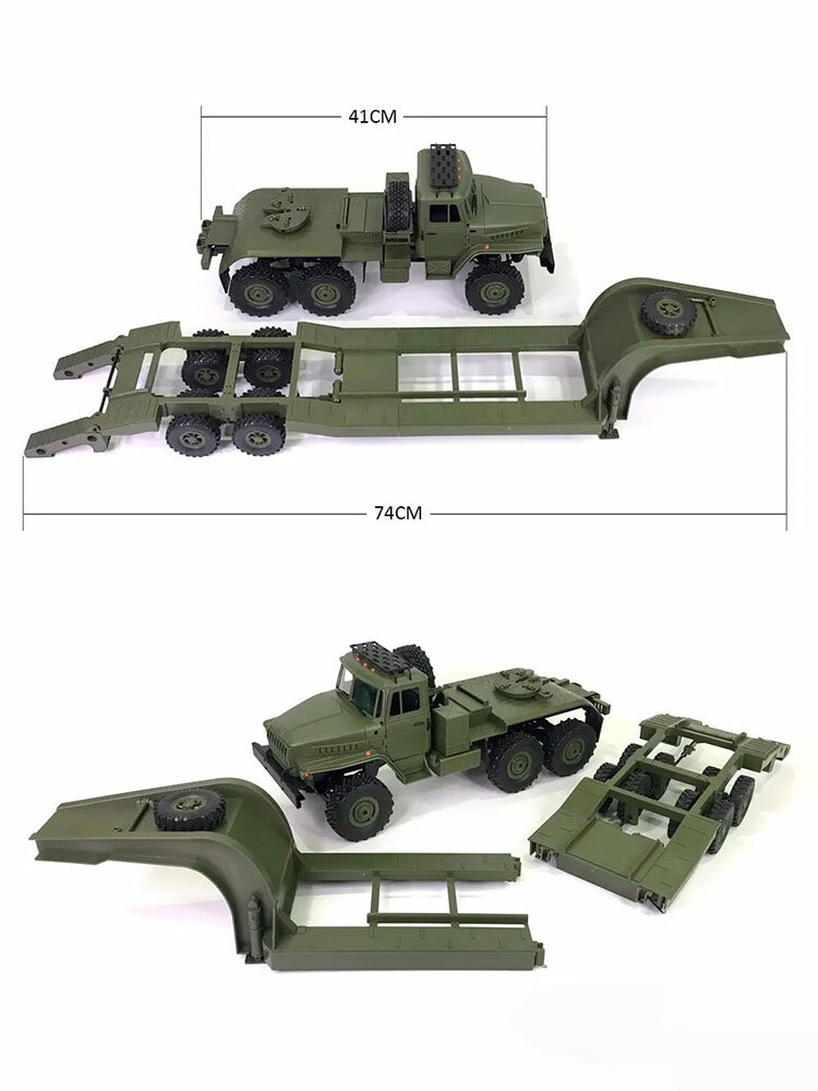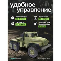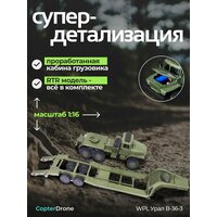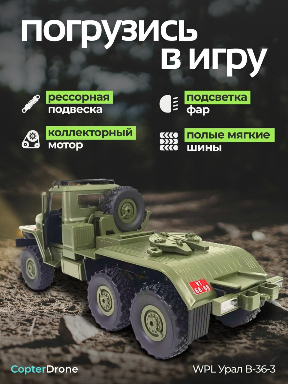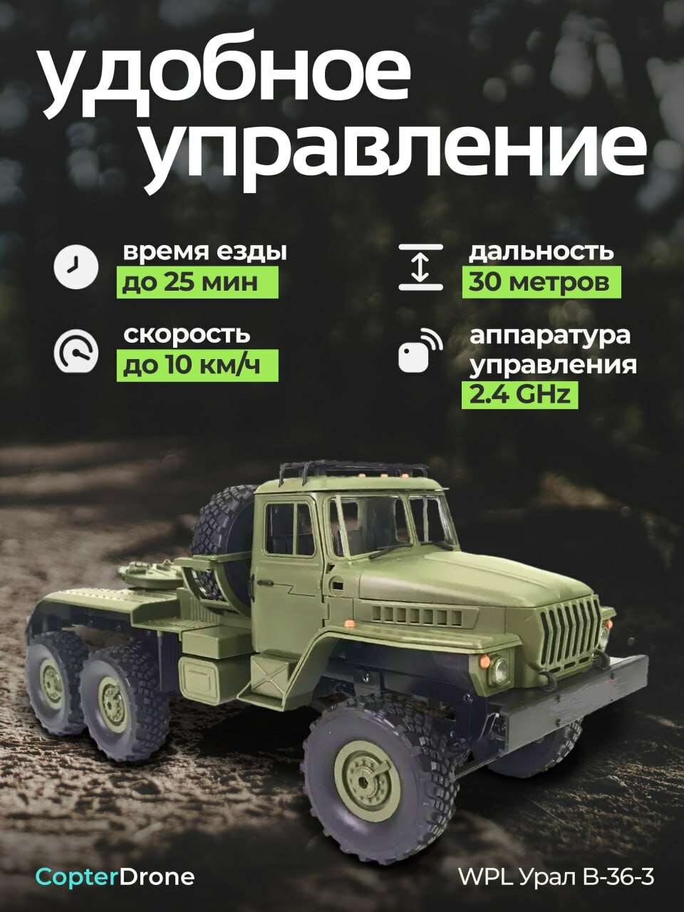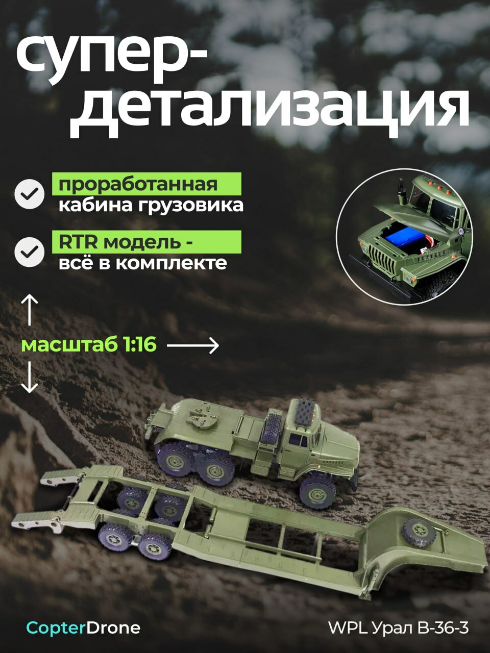 Радиоуправляемая полукопия легендарного советского грузовика «Урал» выполнена в масштабе 1:16, оснащена полным приводом, действующей рессорной подвеской и мощным коллекторным электромотором. Радиоуправляемый «Урал» имеет богатую деталировку, в кабине можно увидеть руль и интерьер. Тралл и кабина изготовлены из прочного АВS пластика и установлены на прочную раму. Литий-ионных аккумулятор 7.4V, 600мАh спрятан под открывающийся капот, там, где у настоящего автомобиля «Урал» расположен мотор.