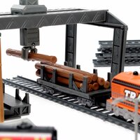 В набор входит: 1 головной вагон, 3 грузовых вагона, рельсы (32 шт.), бревна, 1 погрузчик, станция, тунель и элементы декора.