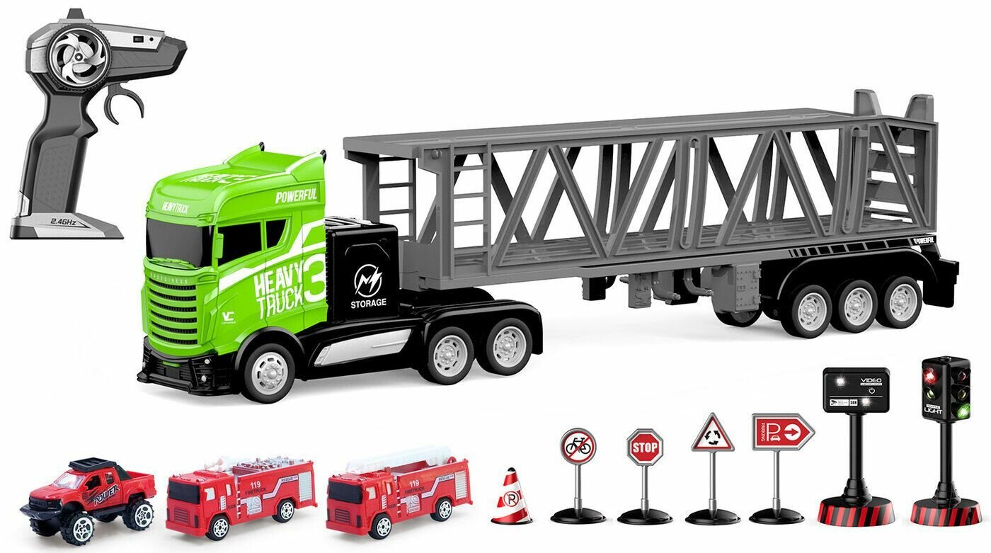Радиоуправляемый автовоз с машинками и набор дорожных знаков (2WD, акб, 1:16) - GM1918C - это отличный подарок для вашего ребенка, который с легкостью придумает огромное количество увлекательных сюжетов для своих игр. Представленная машина выполнена в масштабе 1:16. Современная модель состоит из специального прицепа (автотрейлер) и тягача.