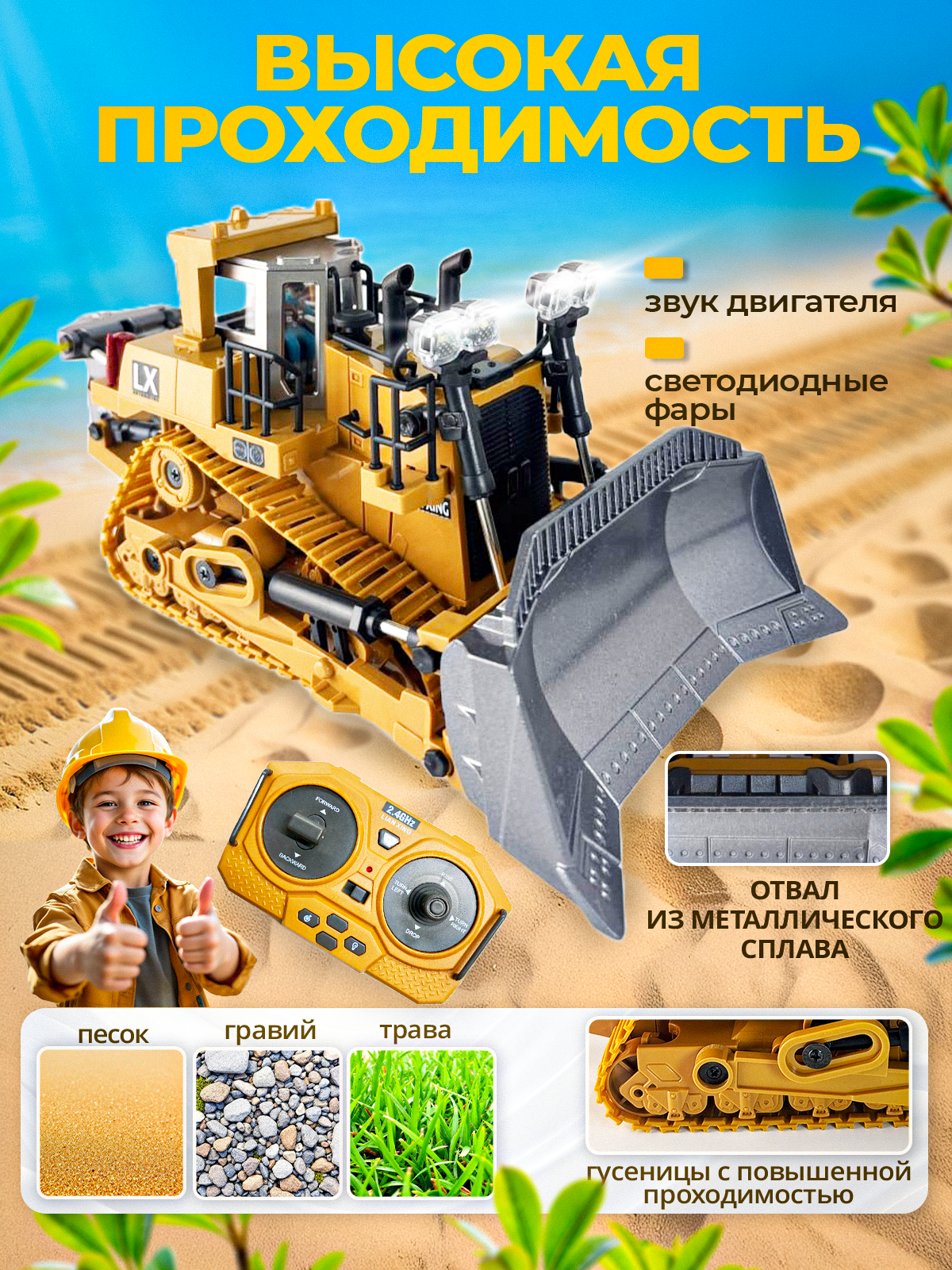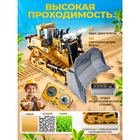 Машина игрушечная на радиоуправлении, бульдозер гусеничный - это уникальная игрушка, которая позволит ребенку почувствовать себя настоящим строителем. Эта машина на радиоуправлении точная копия настоящего бульдозера, выполненная в масштабе 1:20. Радиоуправляемая машинка управляется с помощью пульта радио управления, что позволит даже 5 летнему ребенку полностью контролировать свой транспорт на расстоянии. Внедорожник на радиоуправлении оснащен звуковыми и световыми сигналами, что еще больше привлечет малыша к игре. Что такое бульдозер? Это трактор с ковшом на радиоуправлении, которым трактор на аккумуляторе может делать много полезных дел. Так что наша интерактивная игрушка обязательно понравится Вашему ребенку. Экскаватор на радиоуправлении при помощи двигающегося мощного ковша, может поднять любой грунт весом до 0,8 кг, будь то мелкие камушки или крепкая земля. А если грунт поднять невозможно, на помощь ковшу приходит устройство, расположенное в задней части игрушки на пульте управления - рыхлитель, он поможет разбить твердый грунт или пропахать участок земли. Радио управляемая машина с ковшом подходит для уличных игр, в песочнице, может ездить по бездорожью в лесу, на улице. Благодаря гусеничной конструкции машина на аккумуляторе для детей может ездить по любой поверхности: дорога, песок, камень, гладкий пол, ковер, кафель. Гусеничный грейдер может двигаться в разных направлениях, поворачивать в разные стороны, вращаться на 360 градусов на месте. Модель строительной техники выполнена из прочного пластика и металлического сплава, что гарантирует долговечность игрушек, за счет этого данная бульдозер игрушка намного долговечнее чем пластиковый трактор. Электромашина работает на аккумуляторе, который заряжается с помощью USB кабеля. Пульт работает от 2-х батареек типа АА. Работа пульта управления игрушки: вперед, назад, влево, вправо, движение ковшика, раскопки, демонстрационная кнопка, звуковой эффект запуска двигателя, работы двигателя и выключение двигателя. Радиоуправляемые машины отличный подарок для мальчиков всех возрастов: 4 года, 5 лет, 6 лет, 7 лет, 8 лет. Такие электромашины детские развивают мелкую моторику, внимательность, помогают взаимодействовать с окружающим миром. Кроме того набор строительной техники оценят и взрослые мужчины. Подарить такой автомобиль детский на пульте можно на день рождения, на новый год, 23 февраля и любой другой праздник. Это идеальный подарок для детей, которые любят инженерные транспортные средства, автомобили с дистанционным управлением, игрушки для песочницы, спецтехнику, эскаватор, конструкторы, большие машинки, бульдозер, грузовик, камаз, автовоз, мусоровоз, бетономешалка, тачки, любой электротранспорт. Управляемая гусеничная игрушка с полным приводом и инструментами это настоящая техника в миниатюре для маленьких строителей.