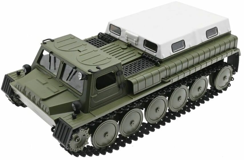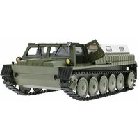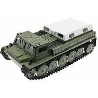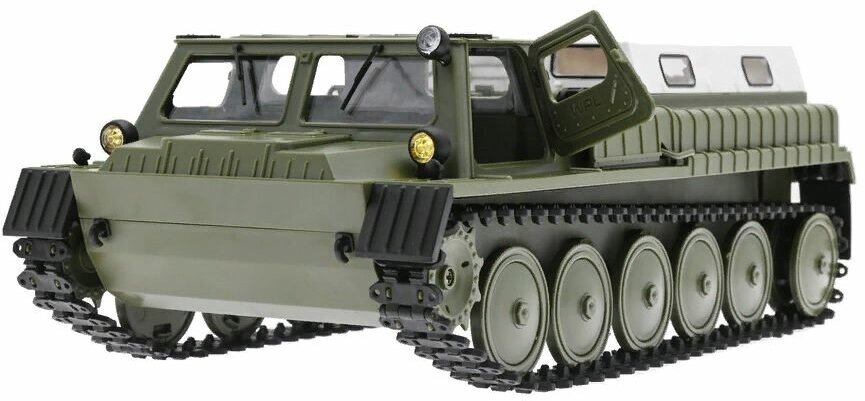 Радиоуправляемая копия легендарного советского вездехода выполнена в масштабе 1/16, оснащена резиновыми гусеницами и двумя мощными коллекторными электромоторами. Радиоуправляемый вездеход выглядит и ездит как настоящий. Модель имеет богатую деталировку, открывающиеся двери и светящиеся фары. При желании можно демонтировать тент и перевозить в кузове грузы.