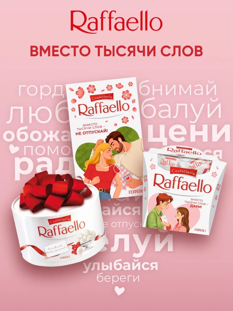 Raffaello - любовь в каждом моменте! Каждый момент может стать поводом выразить свою любовь и привязанность. Raffaello - это идеальный способ дать понять вашим близким, как много они для вас значат, ведь каждый момент с Raffaello становится особенным. Конфеты Raffaello - лучший подарок для вашего любимого человека. Уникальный вкус Raffaello - это незабываемые впечатления, которыми можно насладиться в кругу близких или просто весело провести время. Белый хрустящий миндаль, покрытый бархатистой кремовой начинкой и посыпанный нежной кокосовой стружкой придает непередаваемую нежность вкусу.• Большой подарок в элегантной упаковке• Идеально подходит, чтобы поделиться удовольствием с близкими• Отборный кокосовый орех• Подходит на перекус• Конфеты с миндалем, кокосовая обсыпка• Лучший подарок на праздник.