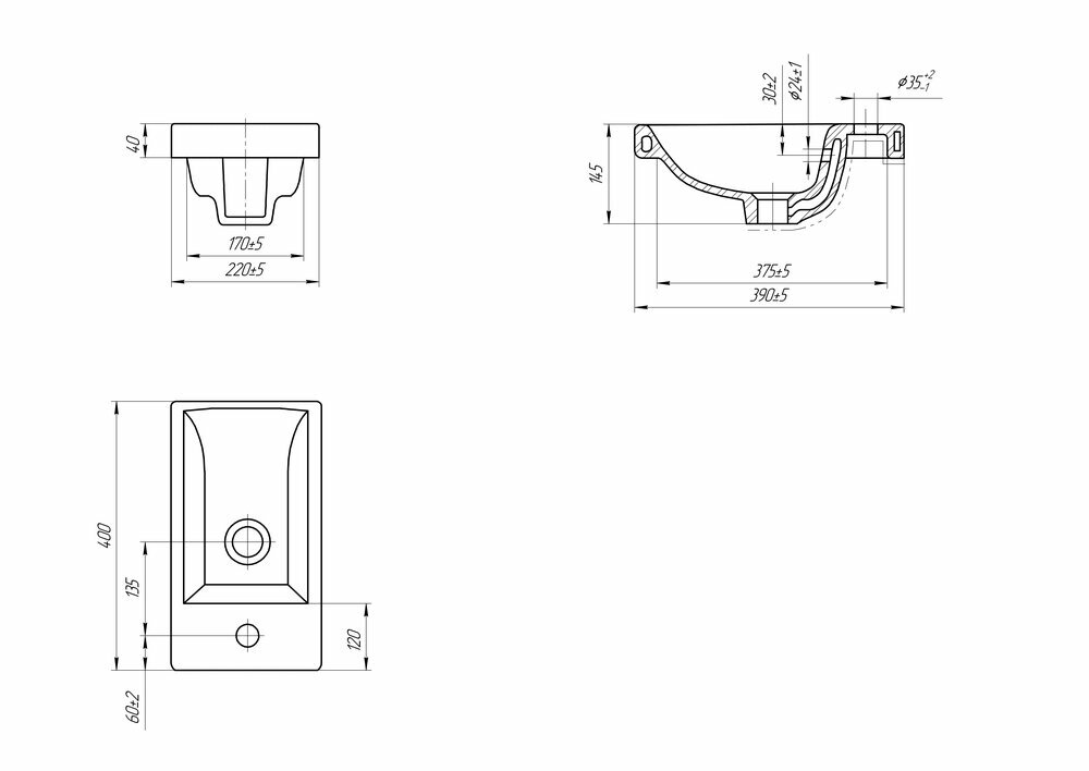 Раковина оснащена центральным отверстием для смесителя, отверстиями слива и перелива.