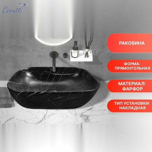 Раковина Ceruttispa CR8217MMB накладная, мрамор матовый черный, прямоугольная 500х395х145 представляет собой стильный элемент для ванной комнаты, объединяющий элегантный дизайн и практичность.