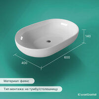 Раковина для ванной накладная EvaGold 600*400*140 мм, модель ND601.10 белый: сравнение цен, характеристики, фото, актуальное наличие и цены.