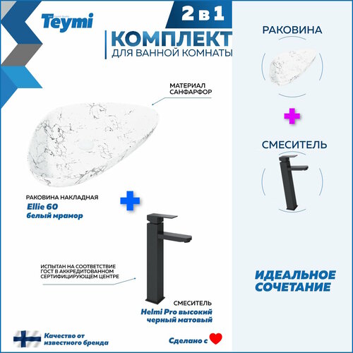 Раковина для ванной накладная Teymi Ellie 60 белый мрамор в комплекте смеситель высокий черный матовый F12852: сравнение цен, характеристики, фото, актуальное наличие и цены.