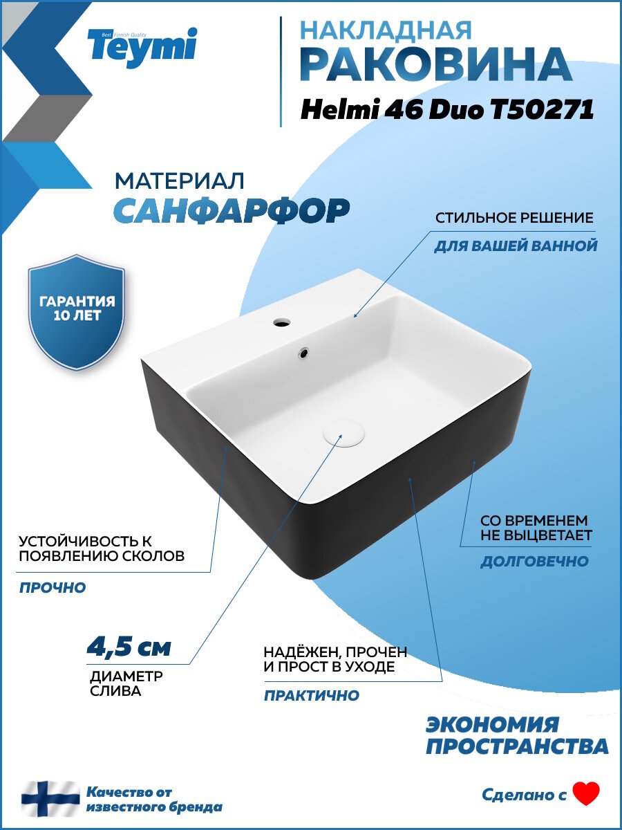 Купить Раковина для ванной накладная Teymi Helmi 46 Duo черно-белый глянец T50271 с доставкой по всей России.