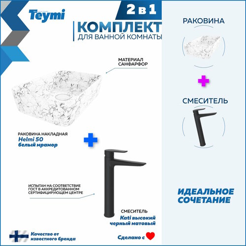 В комплект 2 в 1 входит: 1. Раковина для ванной накладная Teymi Helmi 50 цвет белый мрамор. 2. Смеситель для раковины высокий черный матовый Teymi Kati.