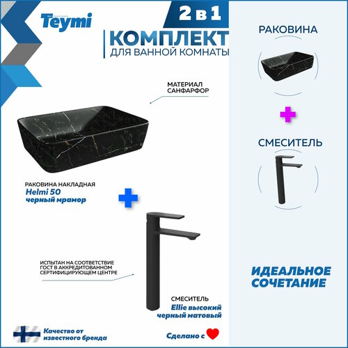 В комплект 2 в 1 входит: 1. Раковина для ванной накладная Teymi Helmi 50 цвет черный мрамор. 2. Смеситель для раковины высокий черный матовый Teymi Ellie.
