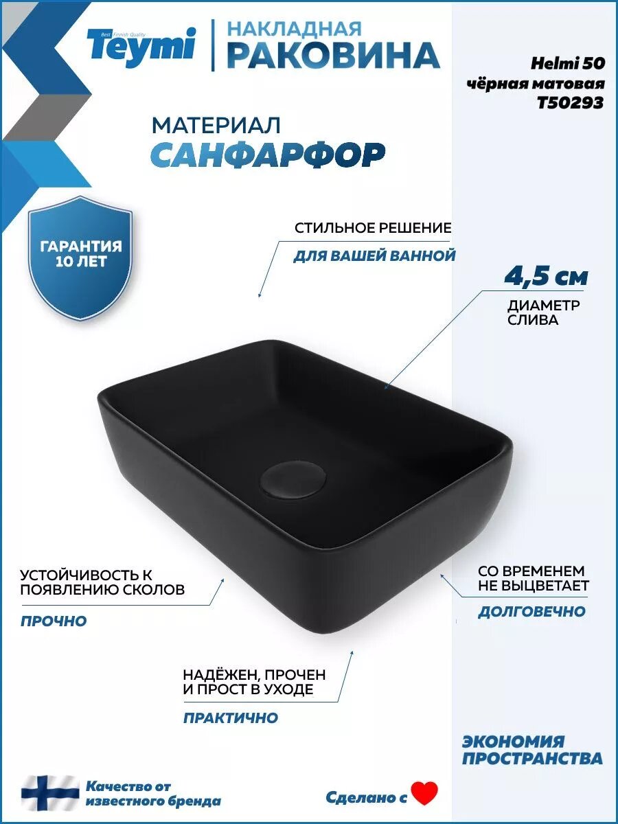 Характеристики: -- Артикул производителя: T50293; -- Серия / коллекция: Helmi; -- Модель: Helmi 50; -- Тип раковины: накладная; -- Установка: на столешницу / на тумбу; -- Возможность встройки: нет; -- Материал изготовления: санфарфор; -- Цвет: Черный матовый; -- Ширина: 475 мм; -- Глубина: 370 мм; -- Высота от столешницы: 140 мм; -- Количество чаш: одна; -- Мыльница: нет; -- Полотенцедержатель: нет; -- Расположение крыла: без крыла; -- Форма: прямоугольная; -- Полочка под смеситель: нет; -- Отверстие под смеситель: нет; -- Отверстие под слив: одно; -- Отверстие под перелив: нет; -- Диаметр сливного отверстия: 45 мм; -- Донный клапан: в поставку не входит; -- Сливная арматура: в поставку не входит; -- Слив-перелив: в поставку не входит; -- Смеситель: в поставку не входит; -- Страна изготовления: Китай; -- Страна бренда: Финляндия; -- Бренд: Teymi.