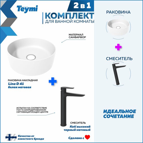 Купить Раковина для ванной накладная Teymi Lina D41 белая матовая в комплекте смеситель высокий черный матовый F12969 с доставкой по всей России. Раковина для ванной накладная Teymi Lina D41 белая матовая в комплекте смеситель высокий черный матовый F12969: сравнение цен, характеристики, фото, актуальное наличие и цены.