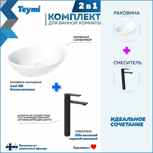 В комплект 2 в 1 входит: 1. Раковина для ванной накладная Teymi Lori 40 цвет белый матовый. 2. Смеситель для раковины высокий черный матовый Teymi Ellie.