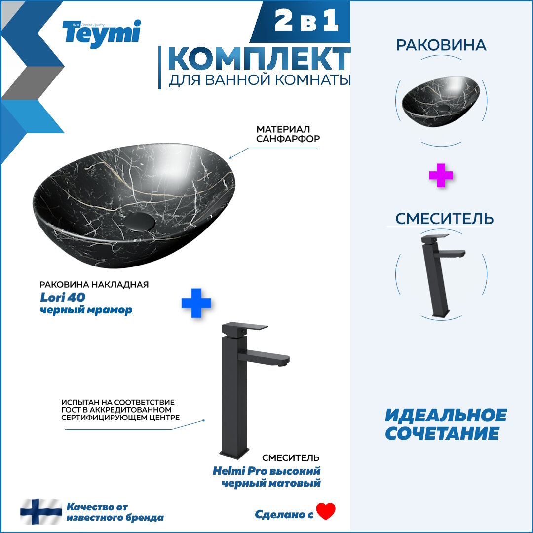 Раковина для ванной накладная Teymi Lori 40 черный мрамор в комплекте смеситель высокий черный матовый F12845: сравнение цен, характеристики, фото, актуальное наличие и цены.