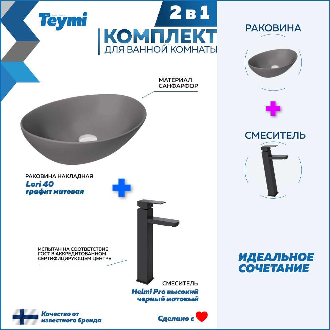 Купить Раковина для ванной накладная Teymi Lori 40 графит матовая в комплекте смеситель высокий черный матовый F12843 с доставкой по всей России.