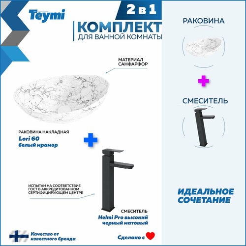 Раковина для ванной накладная Teymi Lori 60 белый мрамор в комплекте смеситель высокий черный матовый F12848: сравнение цен, характеристики, фото, актуальное наличие и цены.