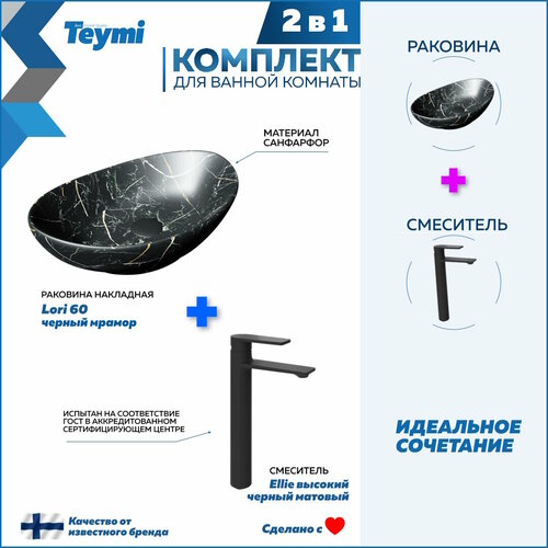В комплект 2 в 1 входит: 1. Раковина для ванной накладная Teymi Lori 60 цвет черный мрамор. 2. Смеситель для раковины высокий черный матовый Teymi Ellie.