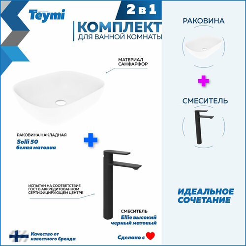 В комплект 2 в 1 входит: 1. Раковина для ванной накладная Teymi Solli 50 artceramic цвет белый матовый. 2. Смеситель для раковины высокий черный матовый Teymi Ellie.