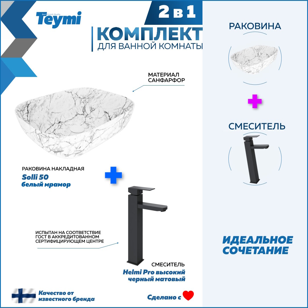 Раковина для ванной накладная Teymi Solli 50 белый мрамор в комплекте смеситель высокий черный матовый F12832: сравнение цен, характеристики, фото, актуальное наличие и цены.