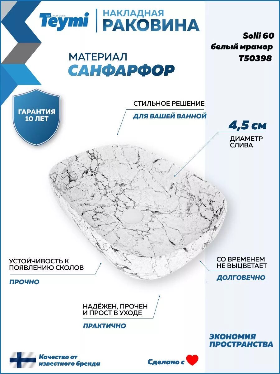 Раковина для ванной накладная Teymi Solli 60 artceramic цвет белый мрамор T50398: сравнение цен, характеристики, фото, актуальное наличие и цены.